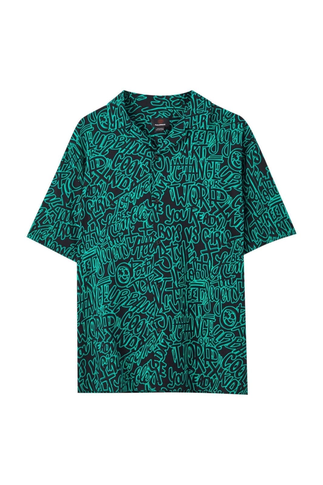 Black viscose shirt with a green graffiti print, short sleeves, a classic collar and a button-up front.R$19.99 -